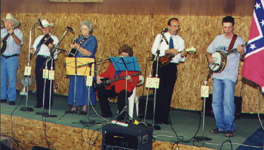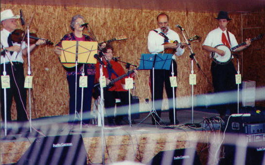 L. to R. - Billy Johnson - guitar (special guest - Friday evening), Mack Farley - fiddle, Evelyn Farley - guitar, Georgia Olson (seated) - bass, Kent Olson - mandolin, Jeremy Moses - banjo.